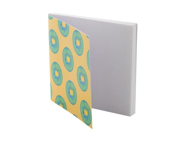 Custom made, paper covered sticky notepad. Includes 50 sheets of recycled paper sticky notes (75×75 mm). Price includes full colour printed outside cover. MOQ: 100 pcs.