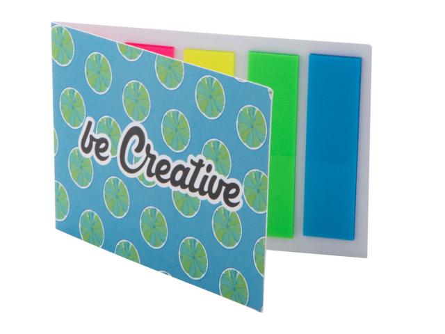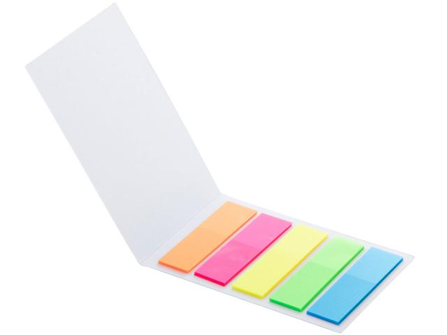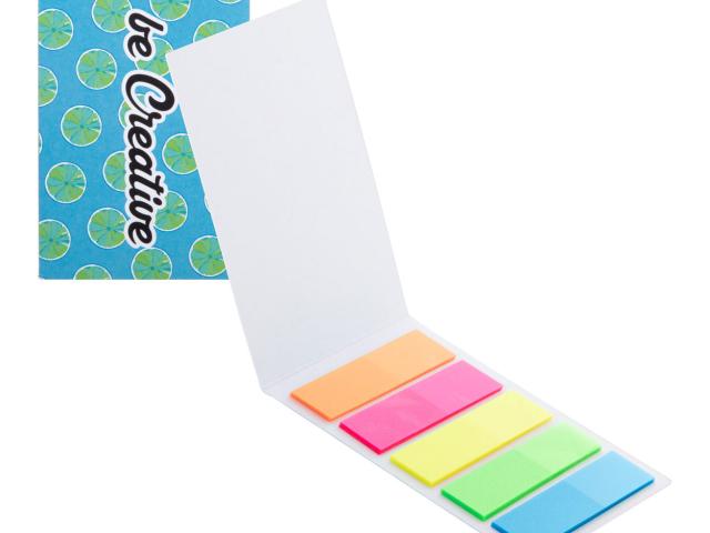 Custom made, paper covered page markers. Includes 100 plastic film page markers in 5 assorted colours (44×12 mm). Price includes full colour printed outside cover. MOQ: 100 pcs.