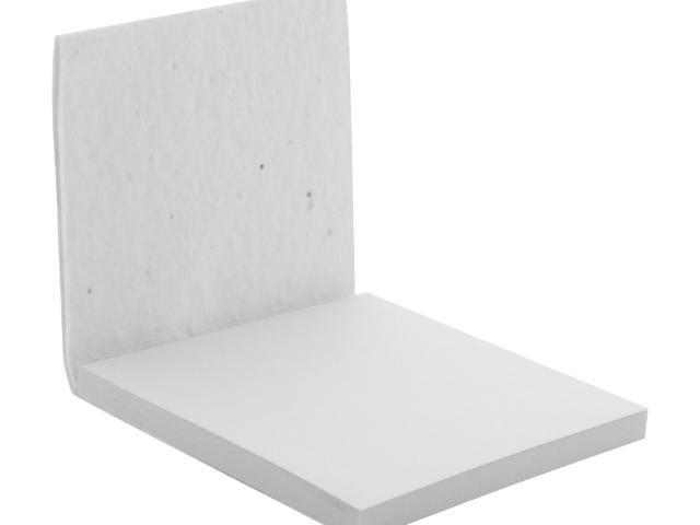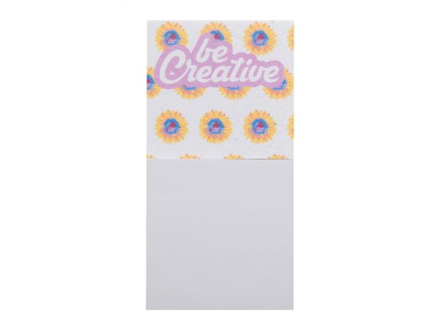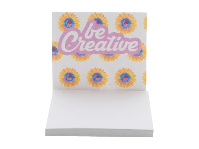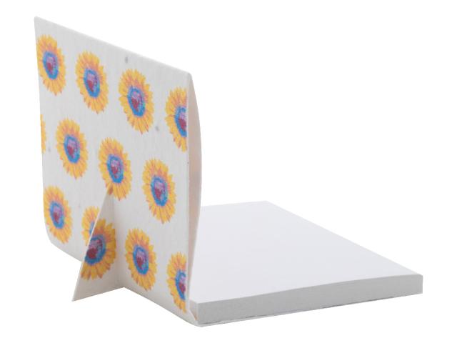 Custom made, seed paper note dispenser with vertical header. Includes 50 sheets of recycled paper sticky notes (75×75 mm). Price includes full colour printing on the holder. MOQ: 100 pcs. With assorted wildflower seeds.