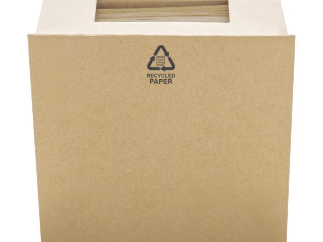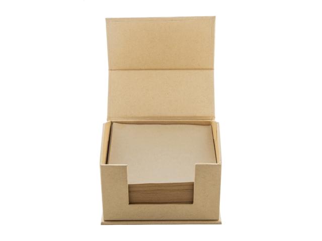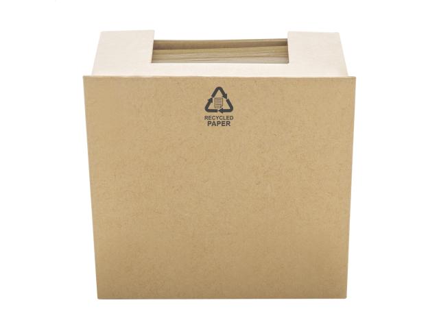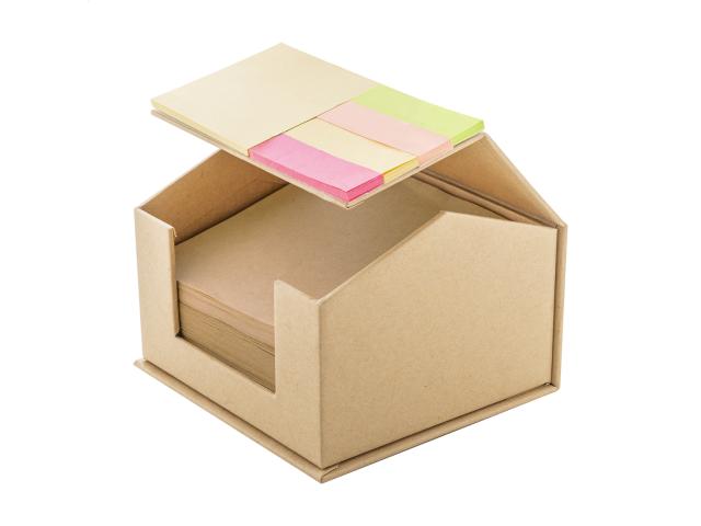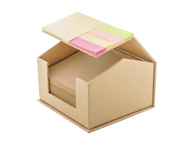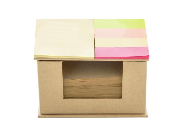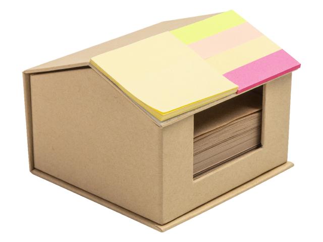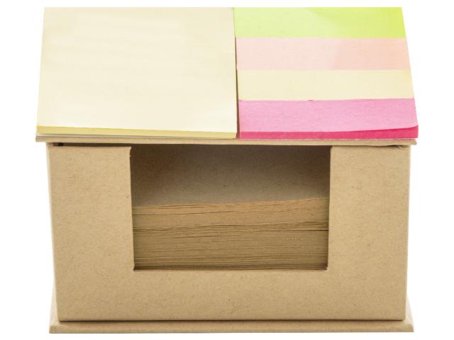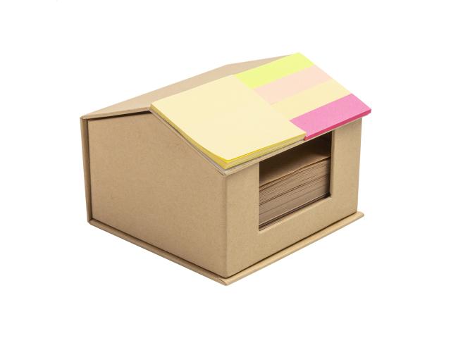 House shaped, recycled cardboard note dispenser with 300 sheets recycled kraft paper memo block. Including 25 yellow sticky notes and 100 page markers (in 4 colours) on the top.