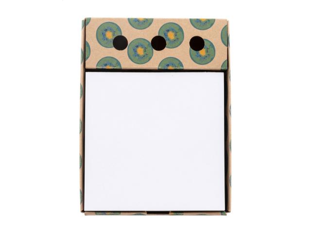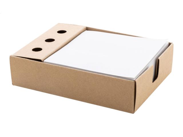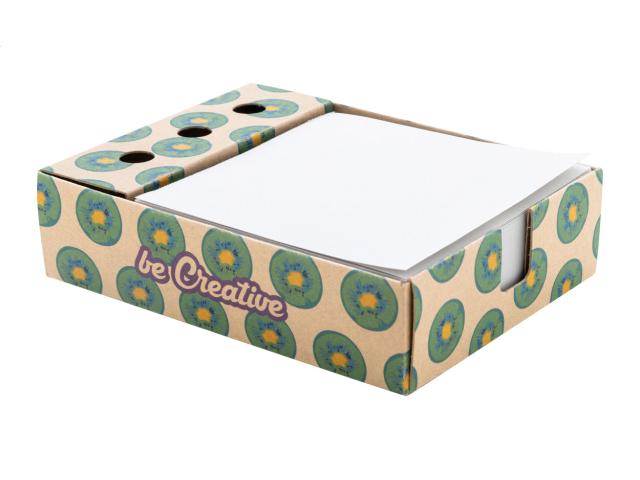 Custom made, kraft paper pen holder and note dispenser with 300 sheets memo block in recycled paper (90×90 mm). Price includes full colour printing on the holder. MOQ: 100 pcs.