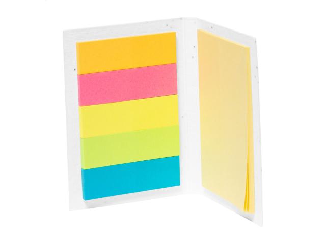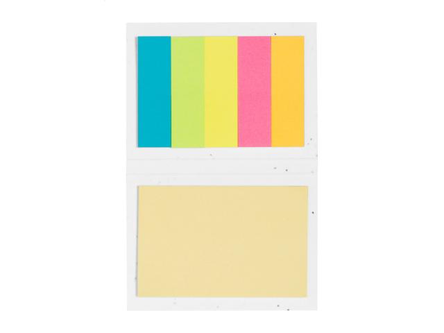 Seed paper covered sticky notepad with 25 notes and 125 page markers (in 5 different colours). The seed paper cover contains petunia seeds in assorted colours, which can be planted by separating the cover from the notepad.