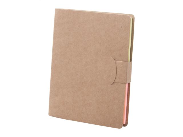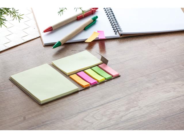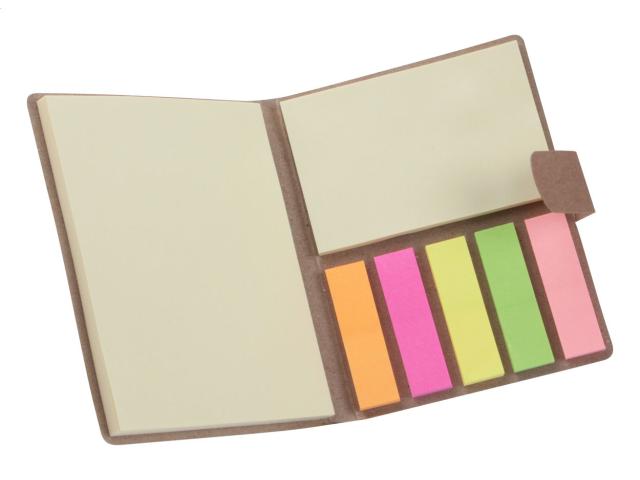 Sticky notepad with 50 large and 25 medium notes and 125 page markers (in 5 different colours) in recycled paper case.