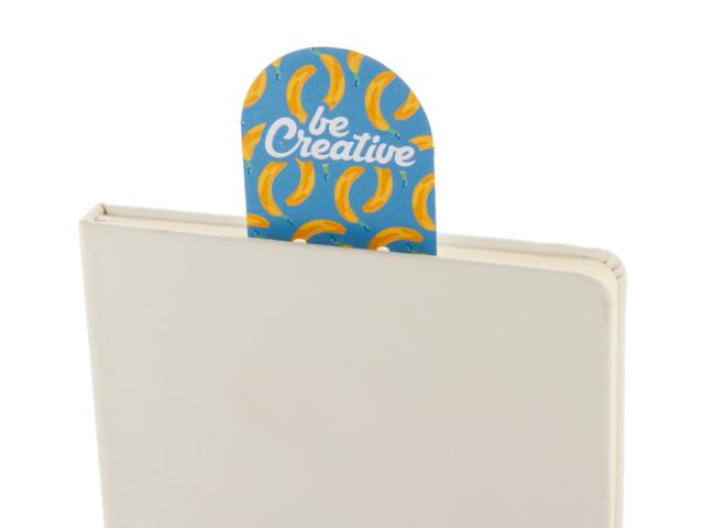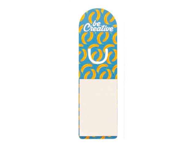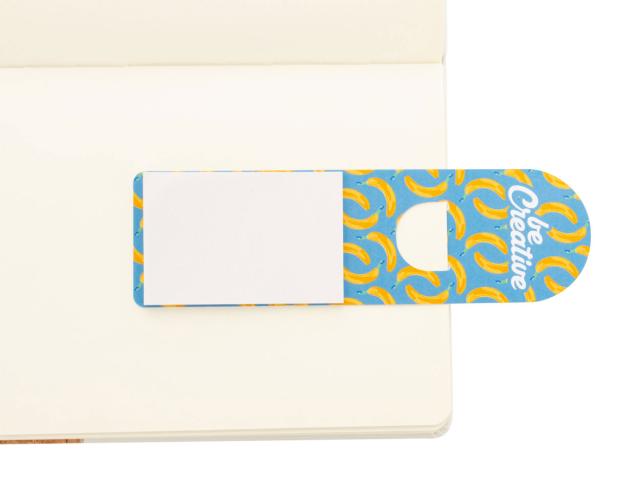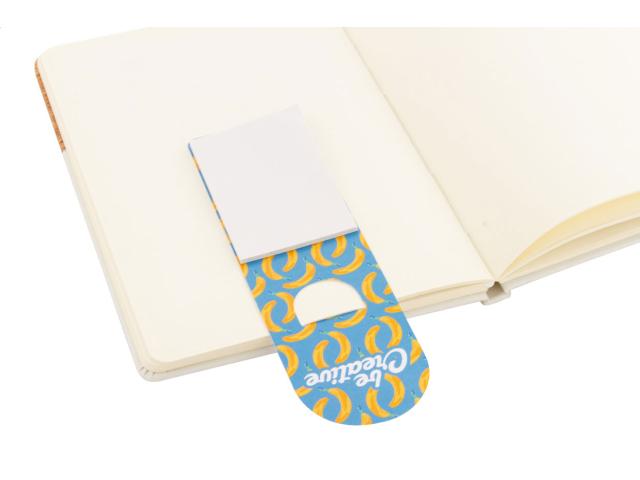Custom made, paper bookmark with sticky notes. Includes 25 sheets of recycled paper sticky notes (50×75 mm). Price includes full colour printing on front side. MOQ: 100 pcs.