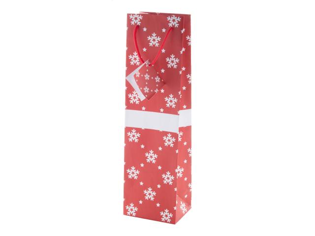 Matte laminated paper gift bag for wine bottle with Christmas design, white printing area and gift tag.