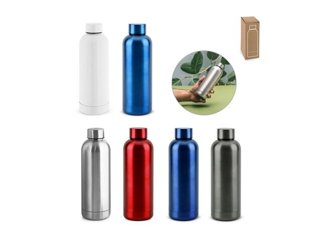 Boca od nehrđajućeg čelika (90% reciklirano) s čepom od nehrđajućeg čelika. Metalik završna obrada (osim u bijeloj boji) i vakumski izolirana dvostruka stijenka. Kapacitet do 550 ml. Isporučuje se u poklon kutiji od kraft papira.