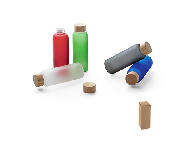Boca od matiranog borosilikatnog stakla s poklopcem od bambusa. Kapaciteta do 500 mL. Isporučuje se u poklon kutiji od kraft papira.Budući da je proizvod izrađen od prirodnih materijala, boja te rezultat ispisa mogu se razlikovati od proizvoda do proizvoda