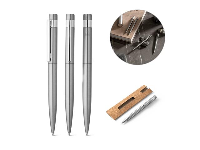 Kemijska olovka s tijelom od nehrđajućeg čelika (53% rSS) i kopčom. Kemijska olovka sadrži plavu tintu i okretni mehanizam. Isporučuje se u poklon vrećici od pluta