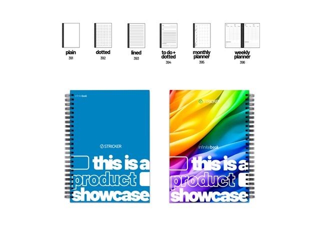 Prezentacija od 20 stranica koja kroz primjere prikazuje uslugu Infinitebook: opcije naslovnice, opcije tiska i opcije stranica (glatke, točkaste, linirane, za zadatke, mjesečno planiranje i tjedno planiranje). 148 x 210 mm