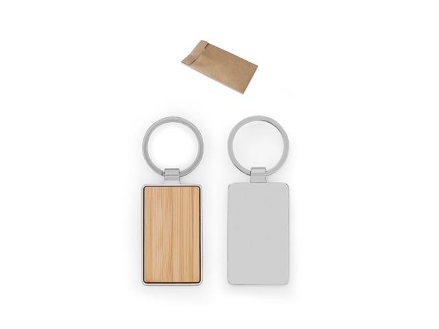Pravokutni privjesak za ključeve od cinka i bambusa. Isporučuje se u vrećici od kraft papira. Budući da je proizvod izrađen od prirodnih materijala, boja te rezultat ispisa mogu se razlikovati od proizvoda do proizvoda. Prsten: ø 32 mm | Proizvod: 51 x 32 x 4 mm | Ukupno: 80 x 32 x 4 mm | Vrećica: 100 x 55 mm