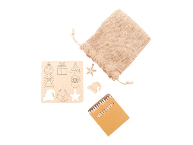 Christmas colouring shape matching game in birch plywood with jute carry pouch. Includes thematic die-cut figures (8 pcs) and wooden coloured pencils (12 pcs) in paper box.