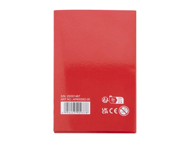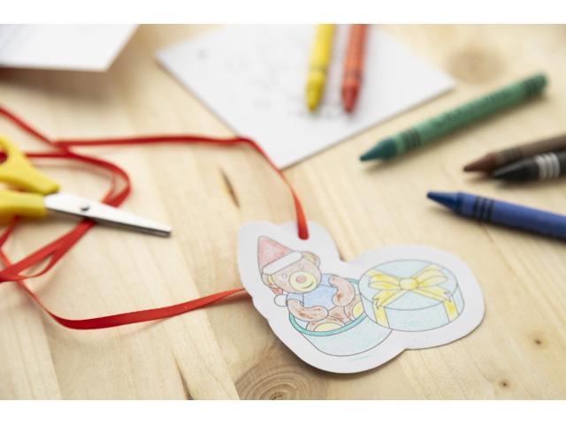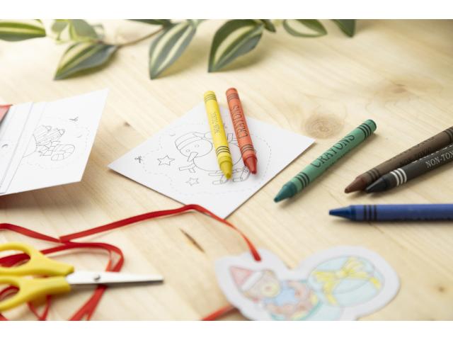 8 pc Christmas colouring set with paper ornaments cards, including 6 crayons and hanging ribbons. In red paper box.