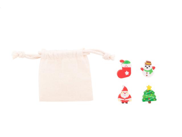 4 pc eraser set in Christmas design, in cotton pouch.