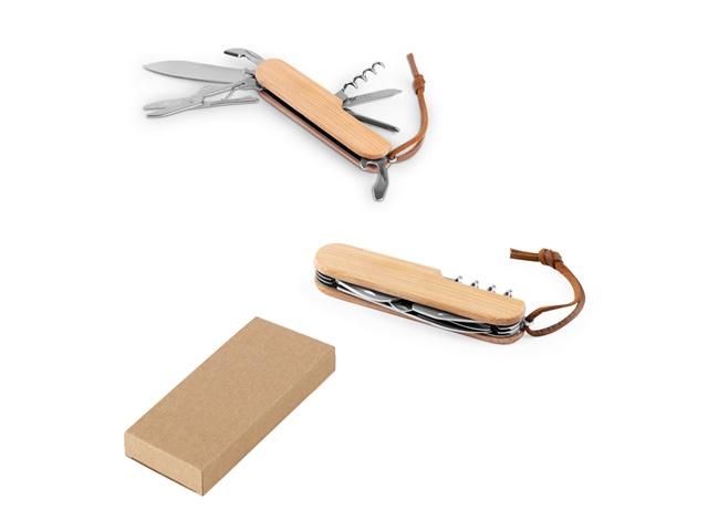 Višenamjenski džepni nož od bambusa, oštrica od nehrđajućeg čelika i PU kabel za jednostavan transport i skladištenje. Sadrži 7 funkcija: oštricu, škare, vadičep, odvijač, otvarač za limenke i boce i turpiju za nokte. Isporučuje se u poklon kutiji od kraft papira. Budući da je proizvod izrađen od prirodnih materijala, boja te rezultat ispisa mogu se razlikovati od proizvoda do proizvoda. 94 x 24 x 15 mm | Kutija: 30 x 20 x 95 mm