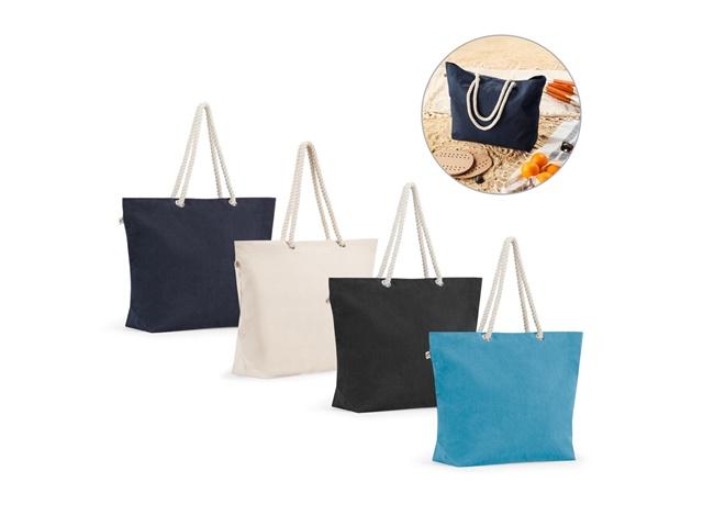 Plažna torba od recikliranog pamuka (70%) i recikliranog poliestera (30%) (220 g/m²). Ručke dužine 65 cm izrađene su od upletenog pamučnog užeta, što daje ugodan osjećaj i podsjeća na nautički stil. Reciklirani pamuk je jednobojan i neobojan. Sirovina se koristi u svom izvornom obliku i boji, bez upotrebe kemikalija za bojenje ili izbjeljivanje, što pridonosi manjem utjecaju. Jednobojna boja se dobiva odabirom reciklirane pređe iste nijanse, a mogu se pojaviti nečistoće i varijacije u boji. 550 x 390 x 150 mm