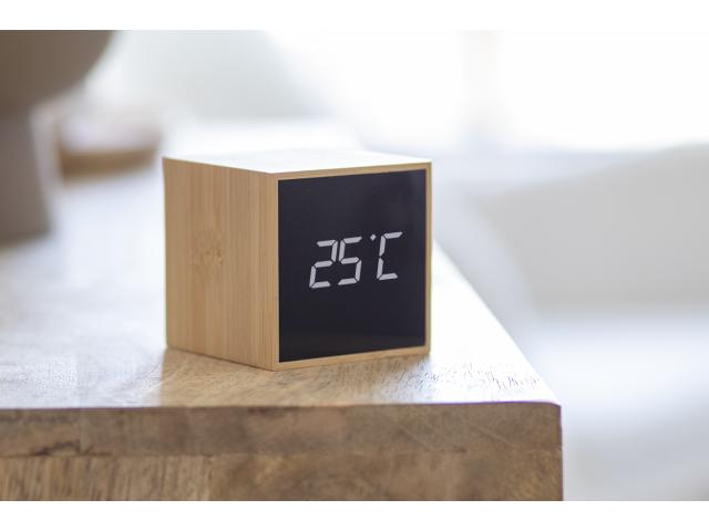 Bamboo covered, digital alarm clock and thermometer with white LED display. It can be powered through the included USB charging cable, or with 3 AAA batteries (without battery).