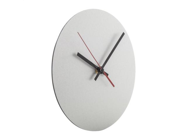 Custom made, brushed aluminium composite wall clock with custom graphic in round shape. Operates with 1 AA battery, without battery. Price includes UV LED printing. MOQ: 25 pcs.