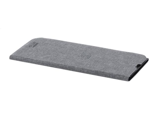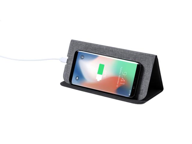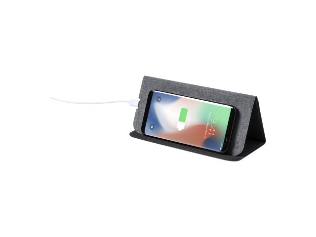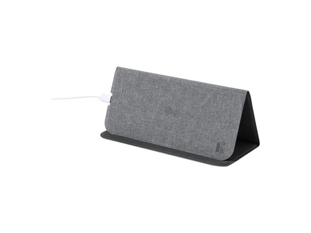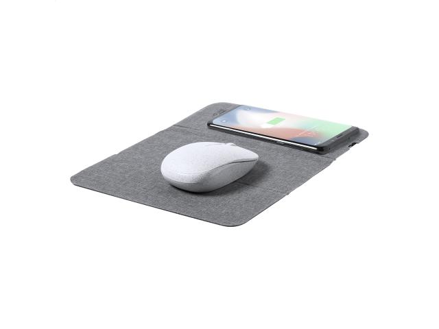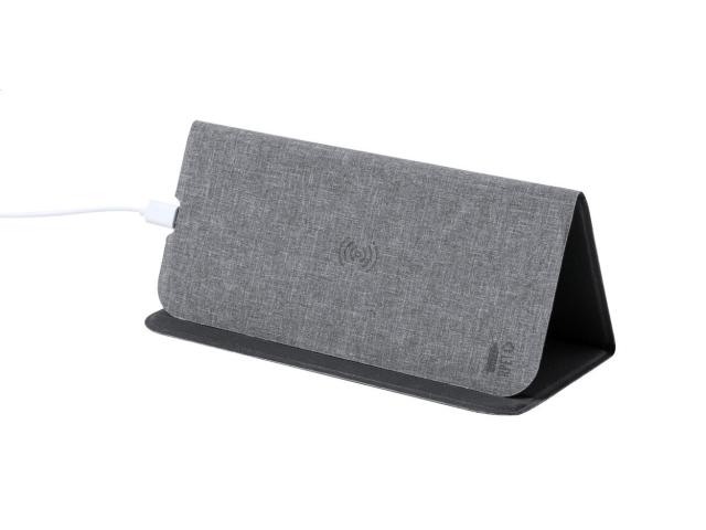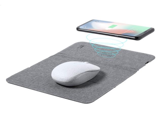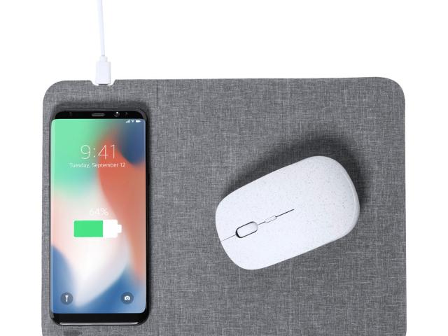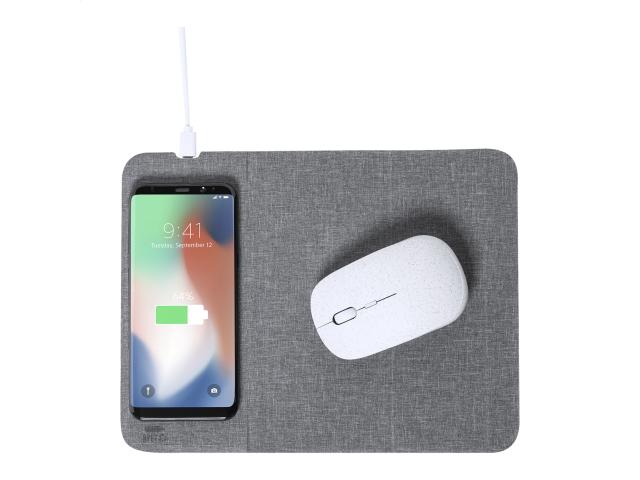 RPET polyester mouse pad with built-in wireless fast charger (10W) and mobile phone holder functions. Including USB charger cable.