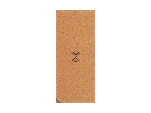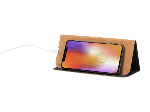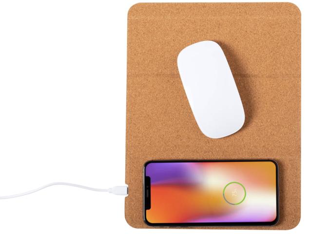 Natural cork mouse pad with built-in wireless charger (5W) and integrated mobile phone holder. Including USB charger cable.