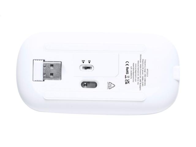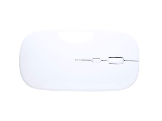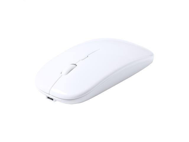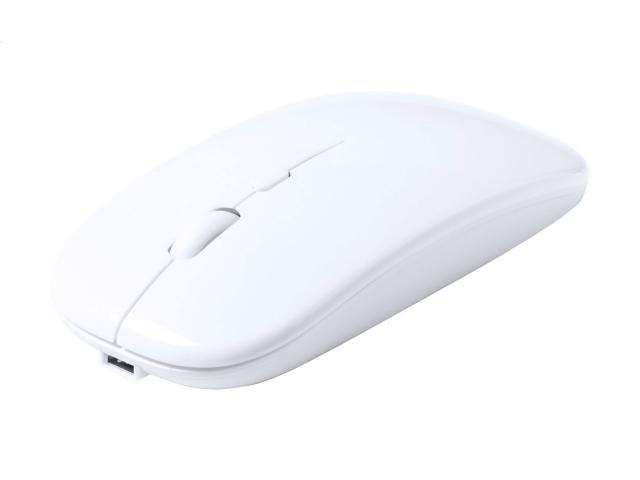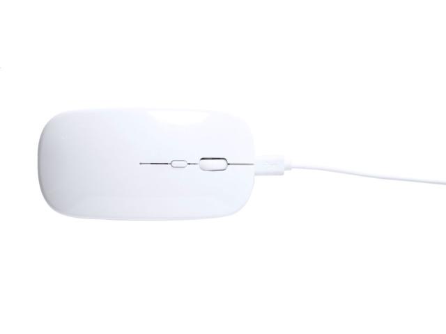 Wireless optical mouse with recycled ABS plastic housing and built-in rechargeable battery. Including USB charger cable.