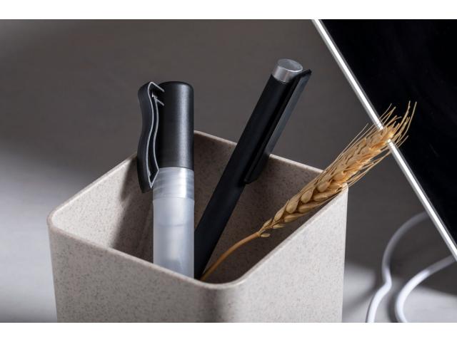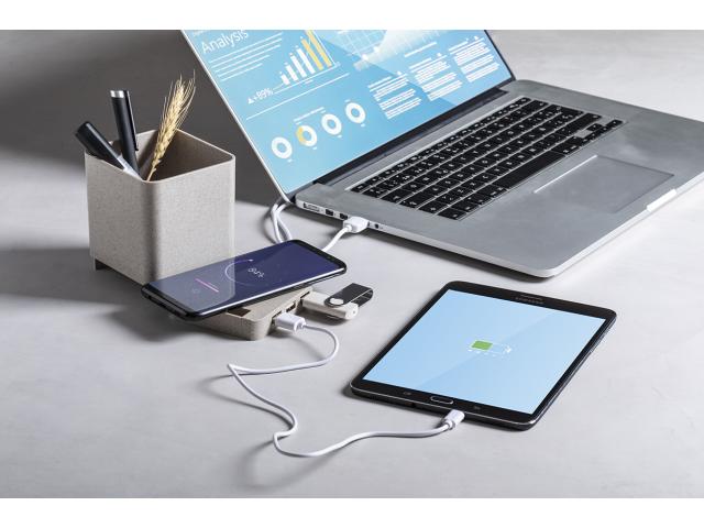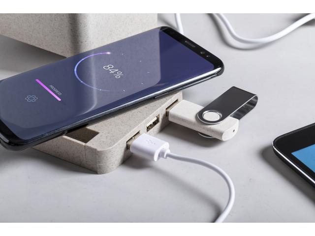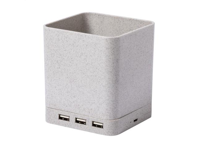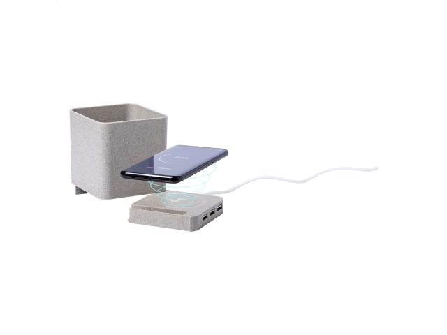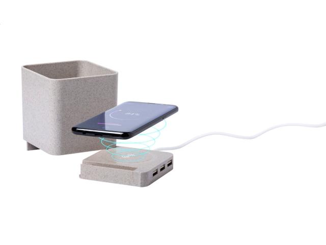 Multifunctional pen holder in ecological wheat straw plastic with mobile phone holder, wireless charger (5W) and 3-port USB hub (USB 2.0). Including USB charger cable.