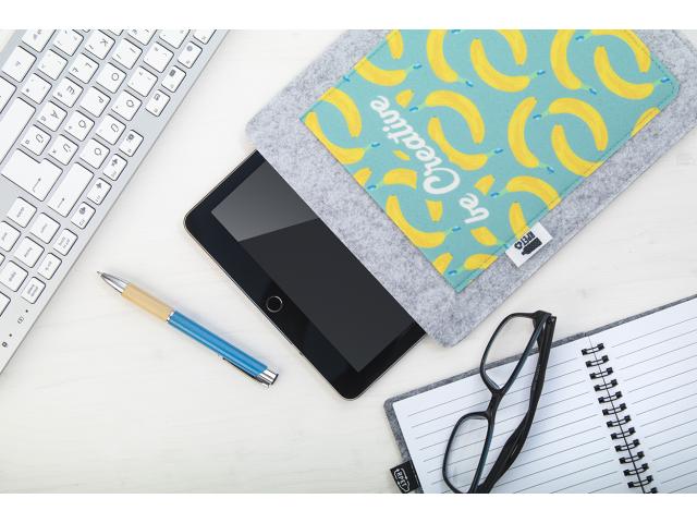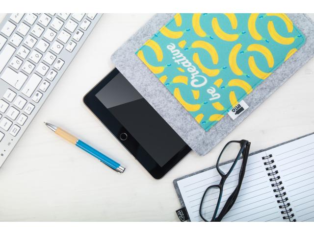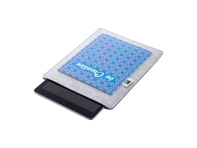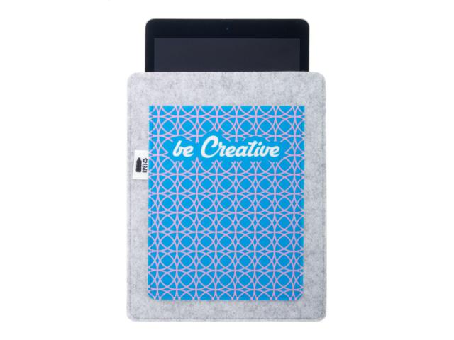 Custom made, RPET felt tablet holder with full-colour printed front pocket. With distinctive RPET label. Fits tablets up to 11". Price includes sublimation printing. MOQ: 25 pcs.