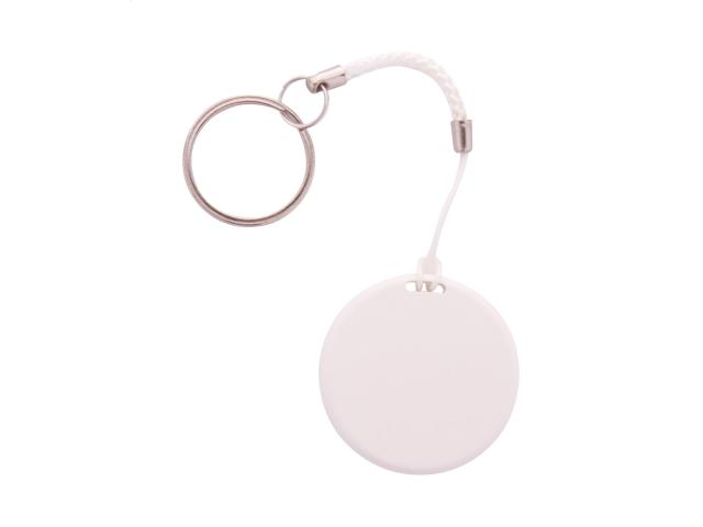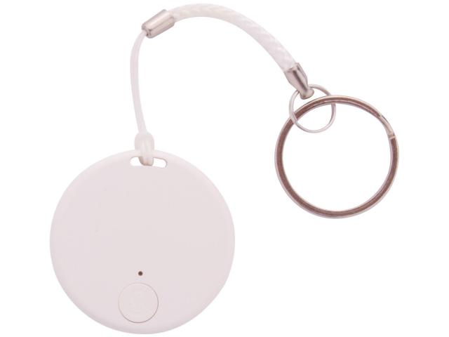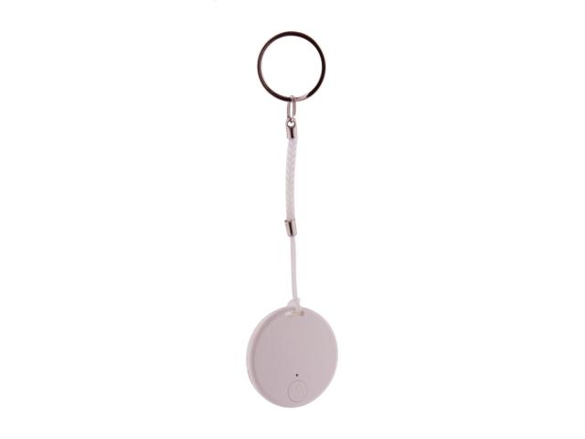 Wireless anti-lost key finder device with camera shutter, in round shaped plastic housing. With string and metal keyring. With button cell battery. Operates with a free iOS / Android App.