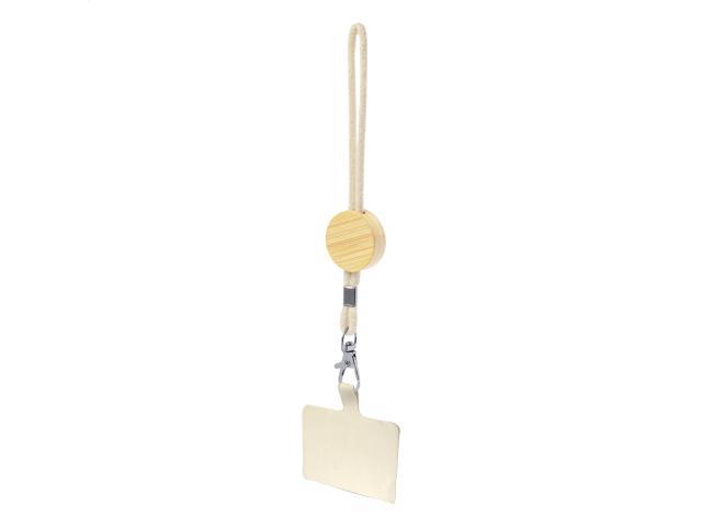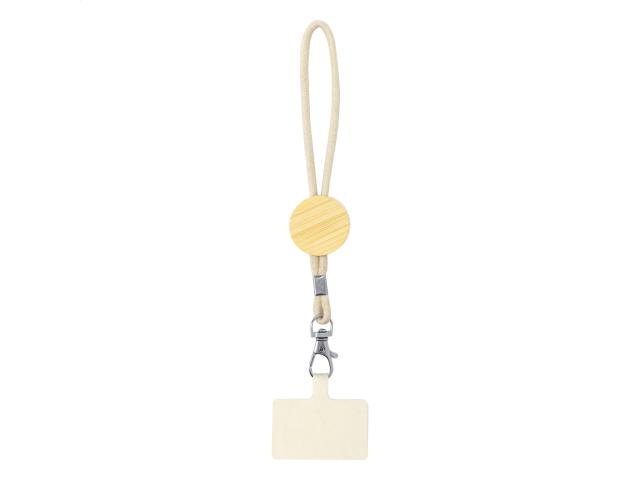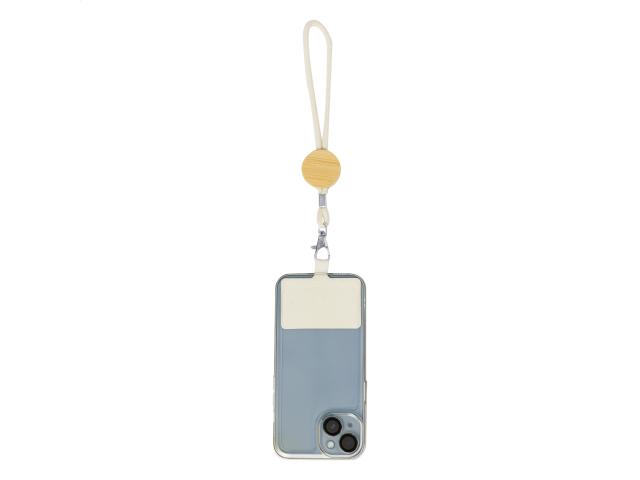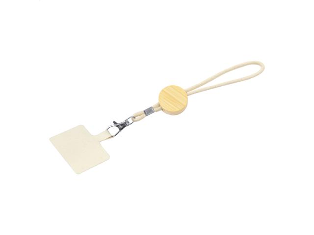 Cotton mobile holder wrist strap with round bamboo tag, phone insert and metal carabiner.