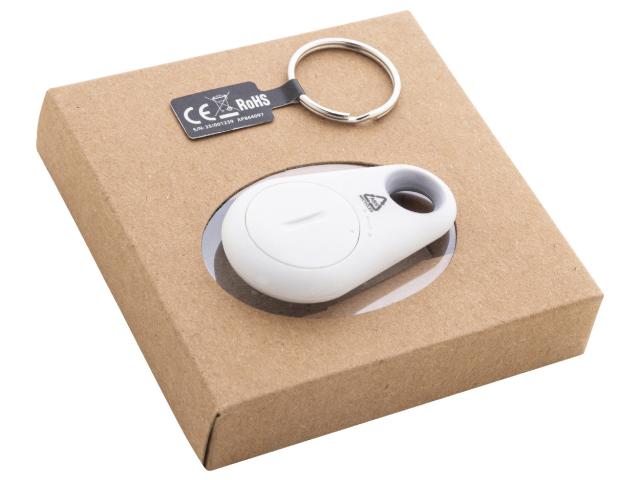 Wireless anti-lost key finder device with camera shutter, in recycled ABS housing. With metal keyring and button cell battery. Operates with a free iOS / Android App.