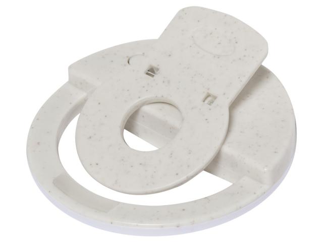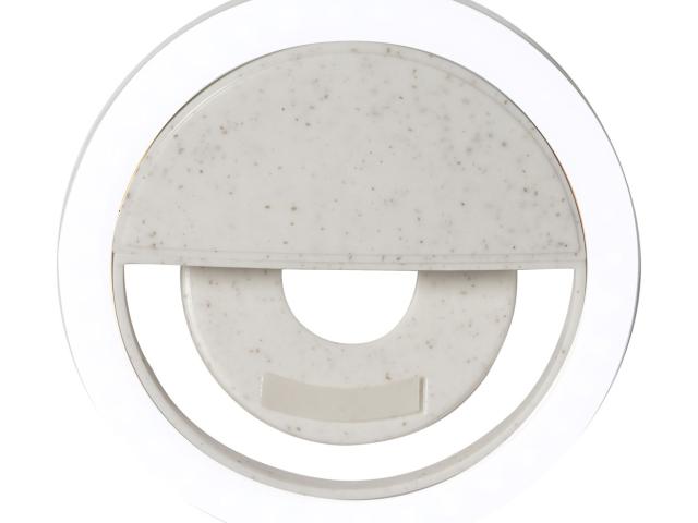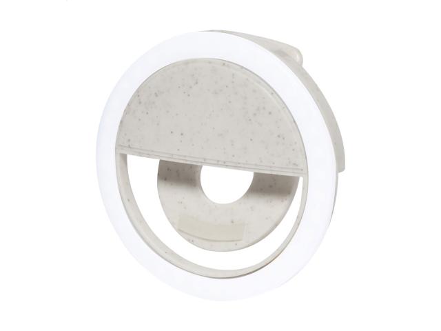 Ecological wheat straw plastic selfie ring light with 36 LED for mobile phones. With 3 adjustable brightness levels and built-in rechargeable battery. Including USB charger cable.