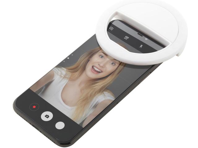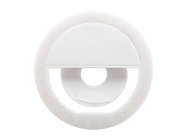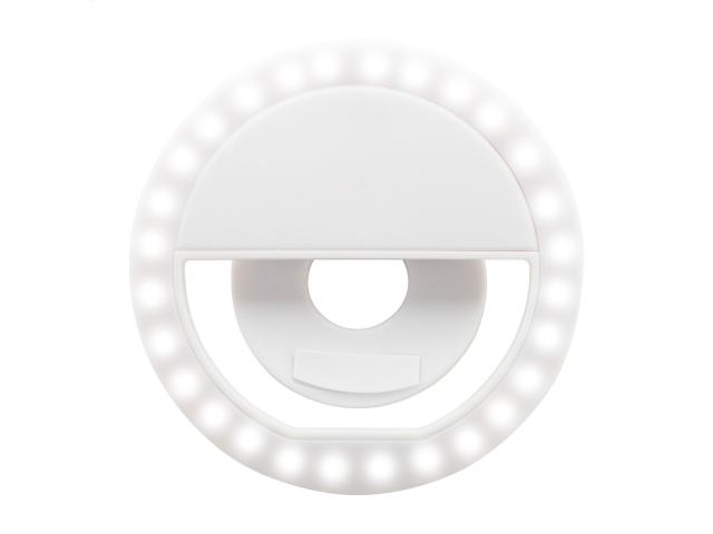 Plastic selfie ring light with 28 LED for mobile phones. With 3 adjustable brightness levels and built-in rechargeable battery. Including USB charger cable.