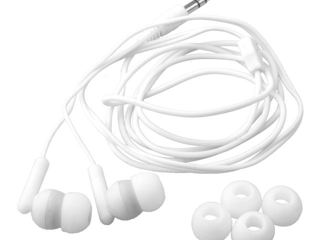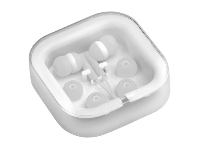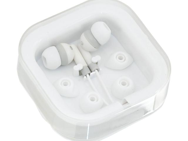 In-ear earphones with 3,5 mm audio jack and 3 pairs of earbuds, in plastic case.