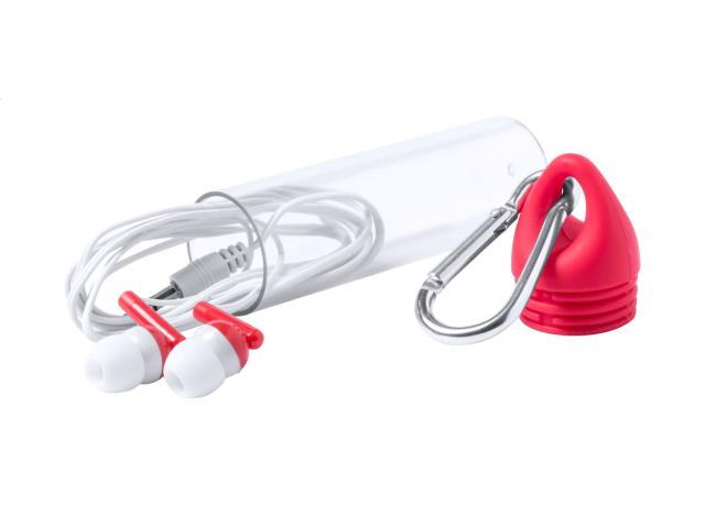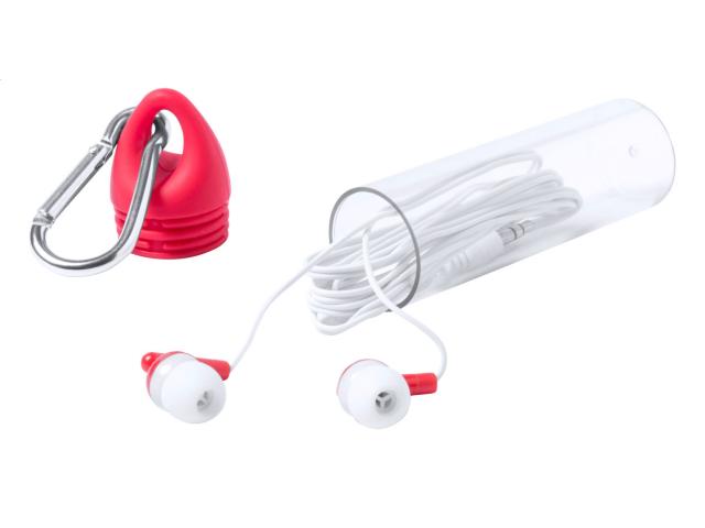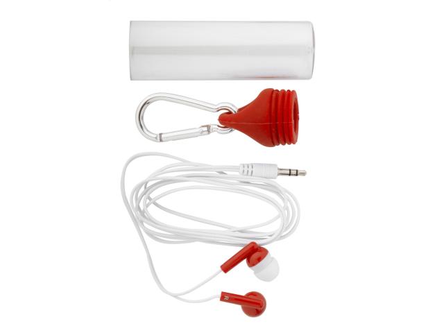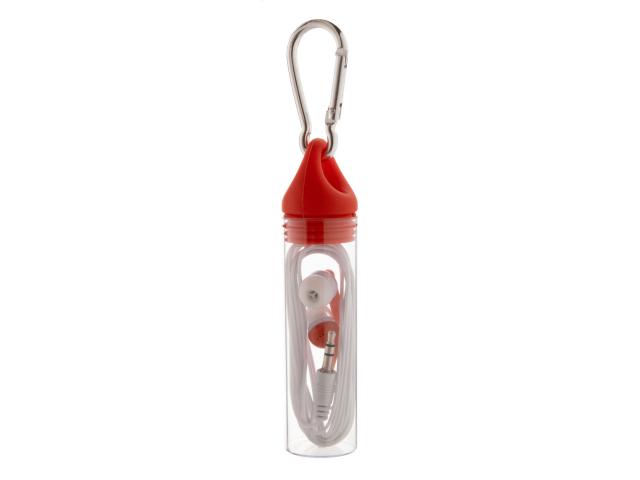 In-ear earphones with 3,5 mm audio jack, in plastic case with carabiner and matching colour cap.
