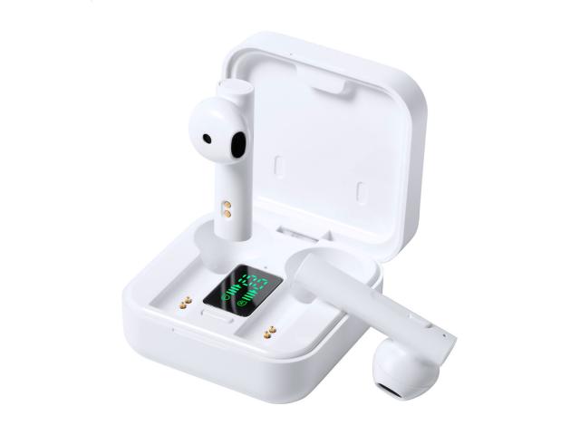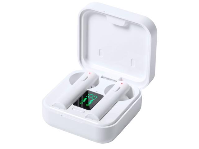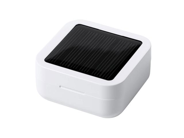True wireless stereo (TWS) earphones with hands-free call function in plastic charger case with solar charger. Including USB charger cable.