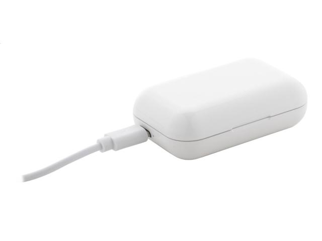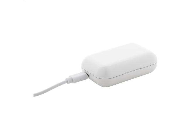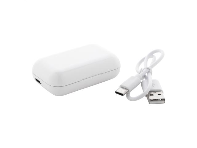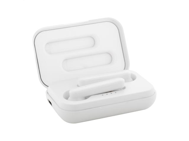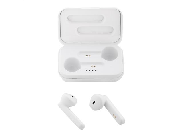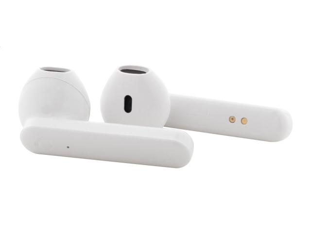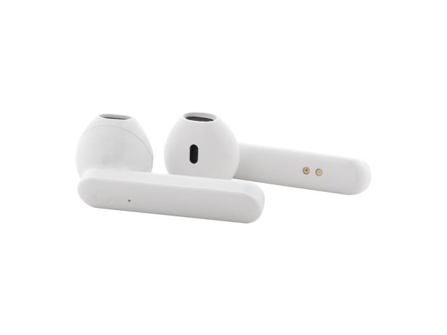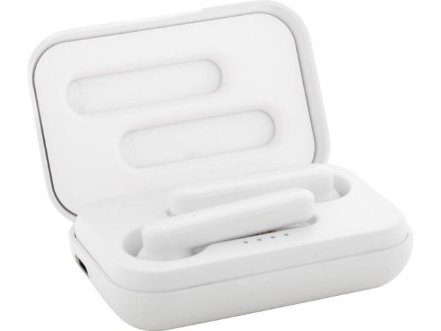 Recycled ABS plastic true wireless stereo (TWS) earphones with hands-free call function, in plastic charger case with 400 mAh battery. Including USB charger cable.