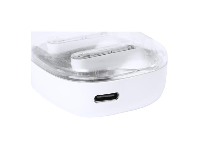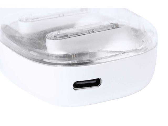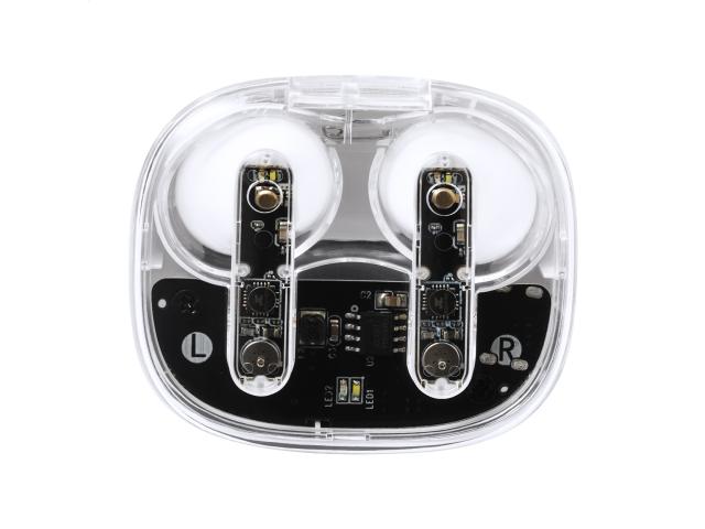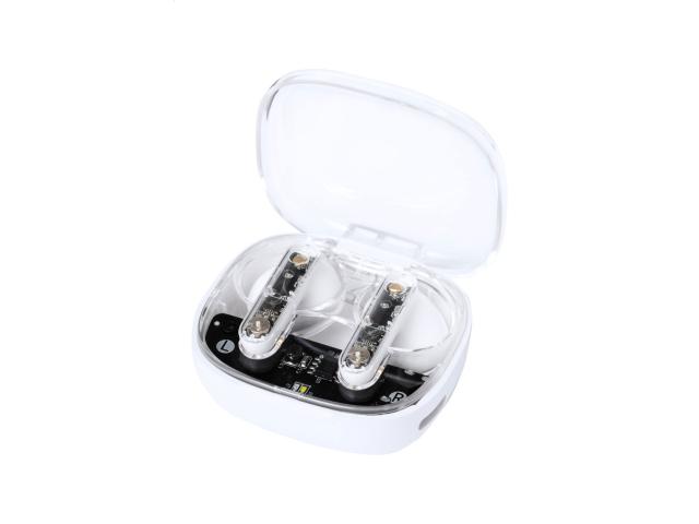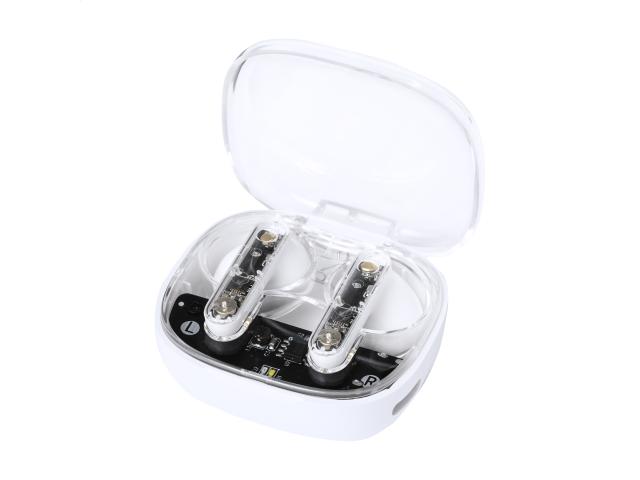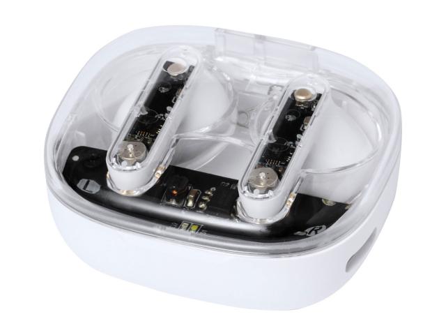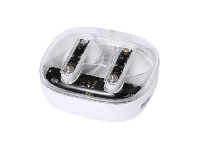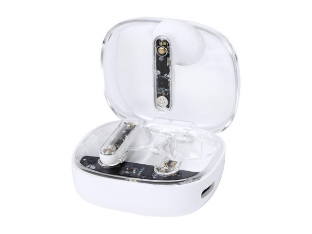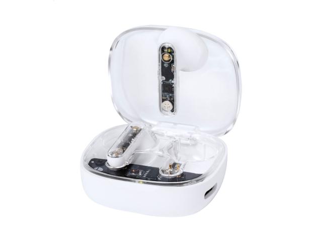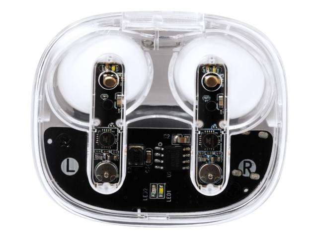 Semi-transparent, true wireless stereo (TWS) earphones with visible electronic components and hands-free call function. In semi-transparent plastic charger case. Including USB charger cable.