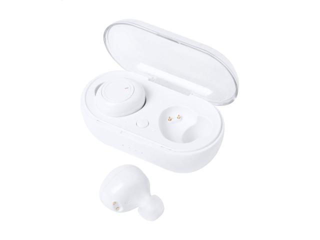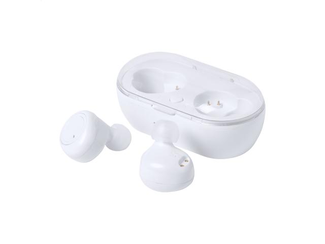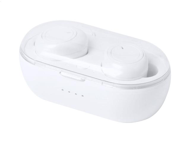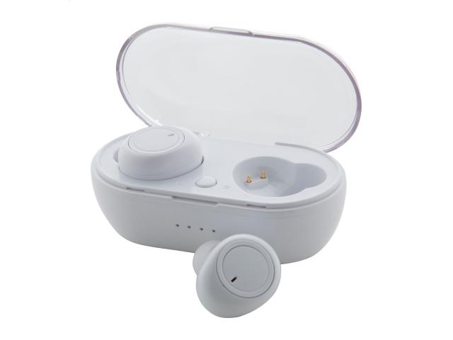 True wireless stereo (TWS) earphones with hands-free call function in plastic charger case. Including USB charger cable.