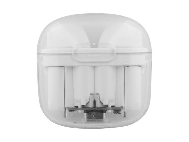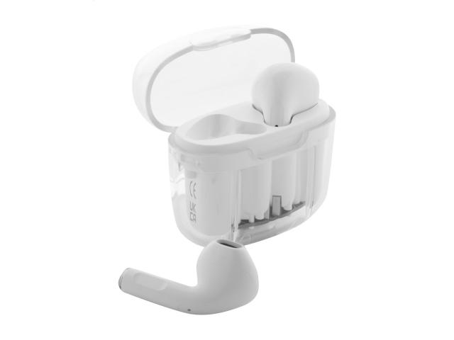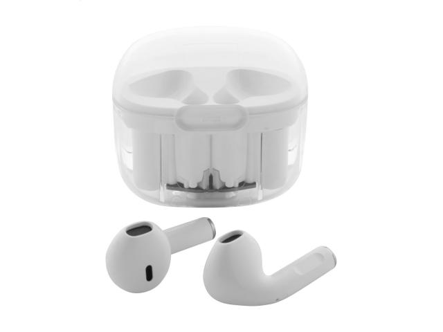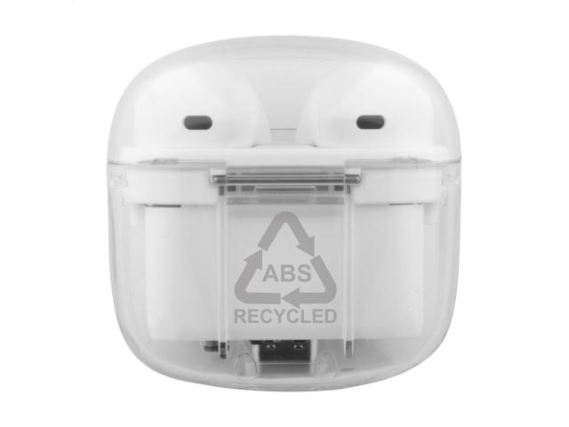 Recycled ABS plastic true wireless stereo (TWS) earphones with hands-free call function, in transparent charger case. Including USB charger cable.