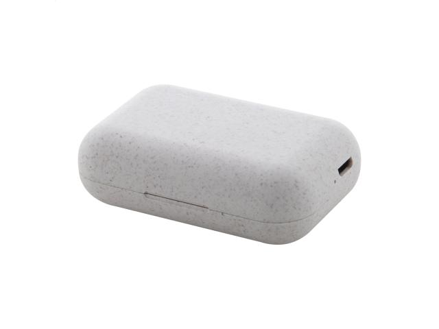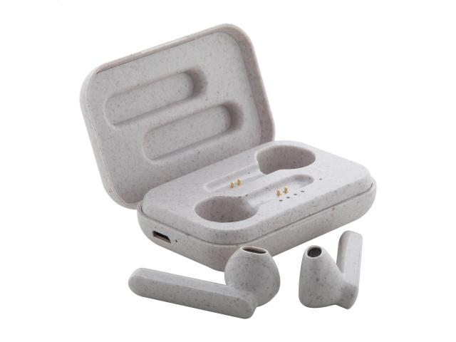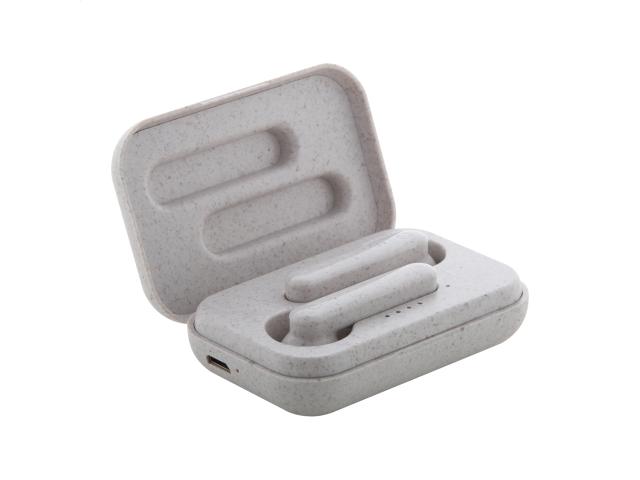Ecological wheat straw plastic, true wireless stereo (TWS) earphones with hands-free call function in charger case. Including USB charger cable. In kraft paper box.