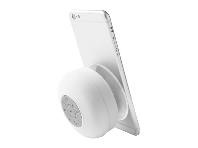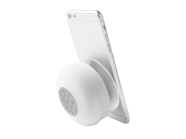 Wireless speaker with rubber-coated housing and large suction cup. With hands-free call function and built-in rechargeable battery. Including USB charger cable.