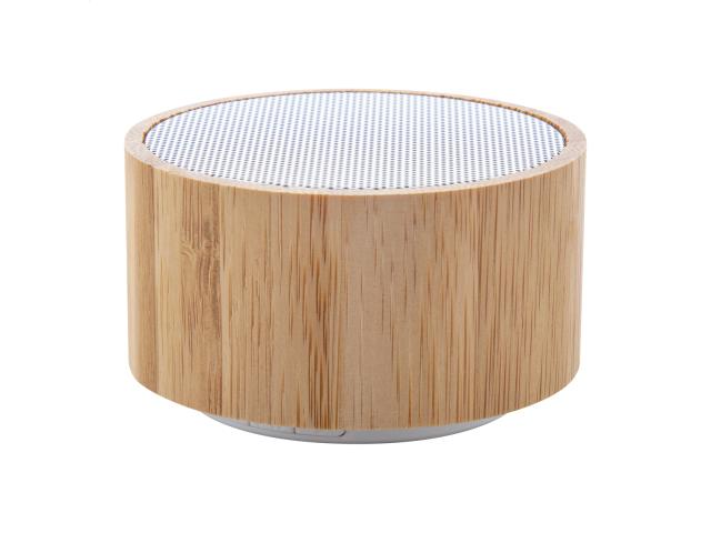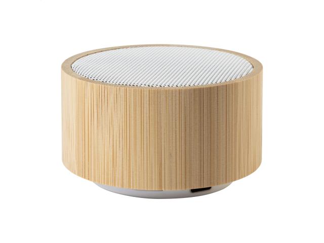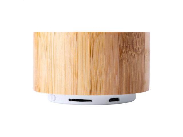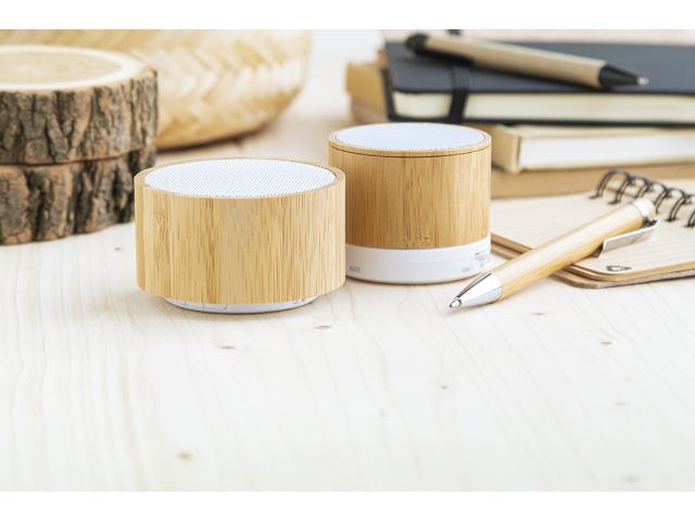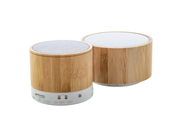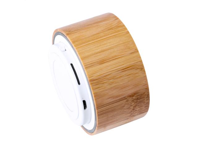 Wireless speaker in bamboo housing with hands-free call function, FM radio and built-in rechargeable battery. Including USB charger cable.