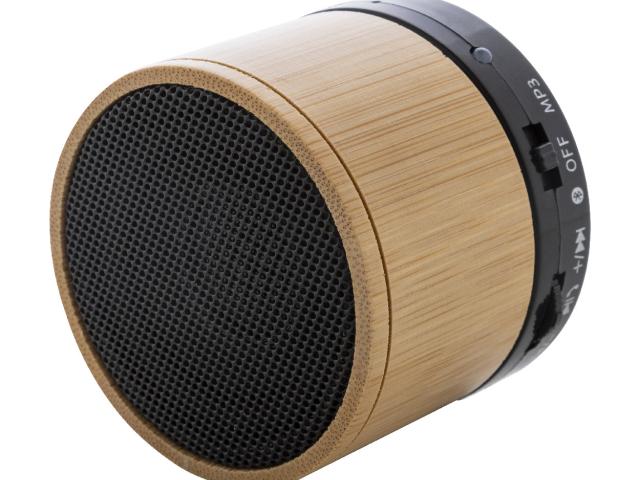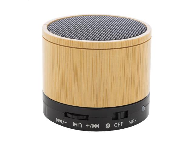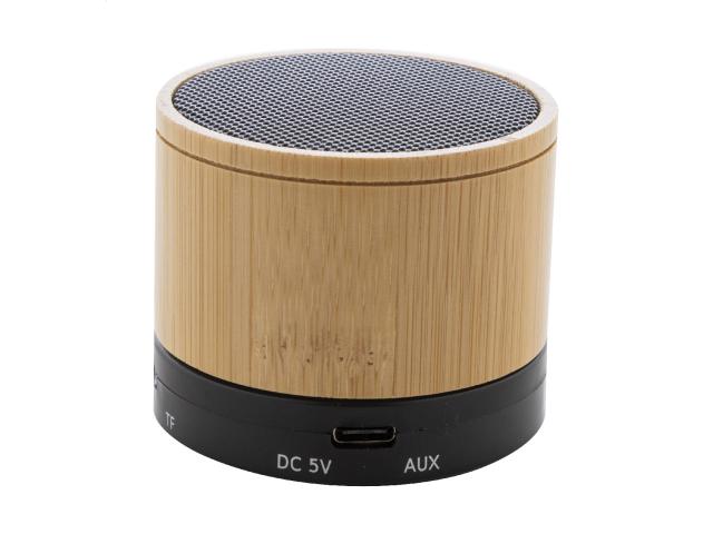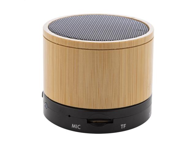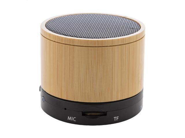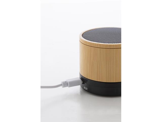 Wireless speaker in recycled ABS and bamboo housing with metal mesh and rechargeable battery (300 mAh). With hands-free call and micro SD MP3 playback functions. Including USB charger cable.