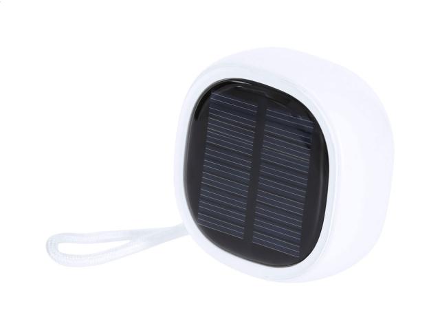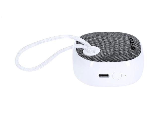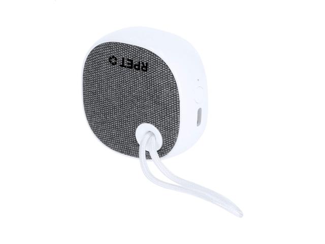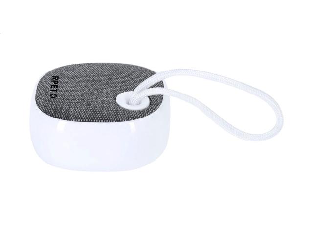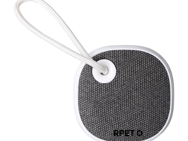 Recycled ABS plastic wireless speaker with RPET polyester side, built-in solar charger, carry strap and rechargeable battery (300 mAh). Including USB charger cable.