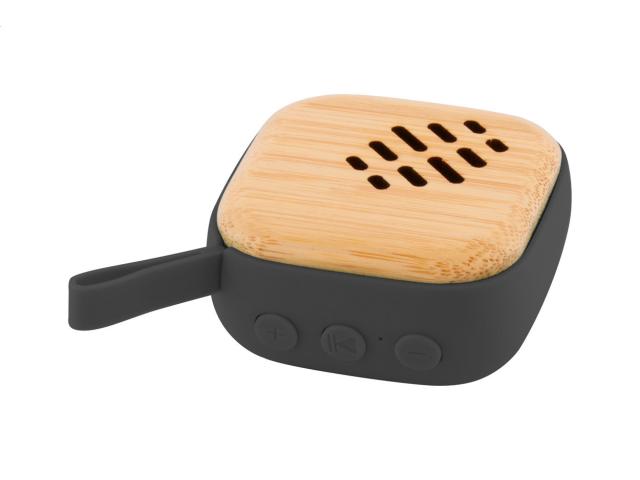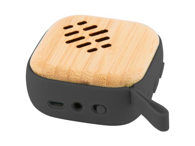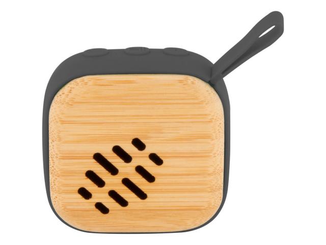 Wireless speaker in bamboo and ABS plastic housing with hands-free call function and built-in rechargeable battery. Including USB charger cable.