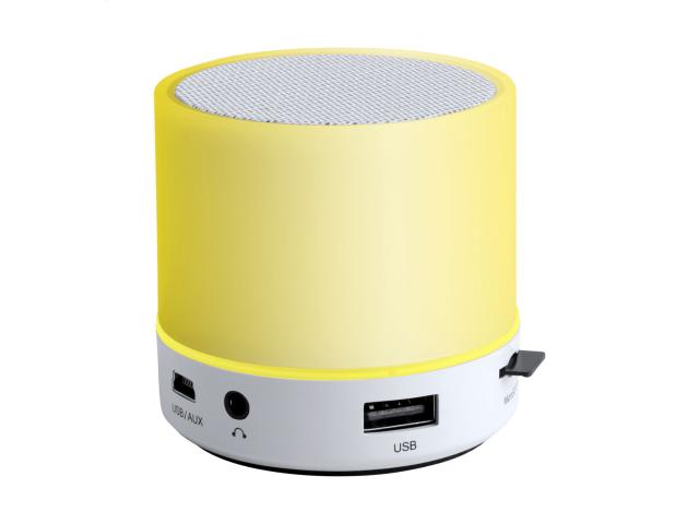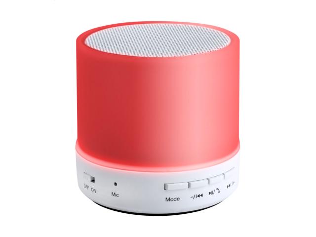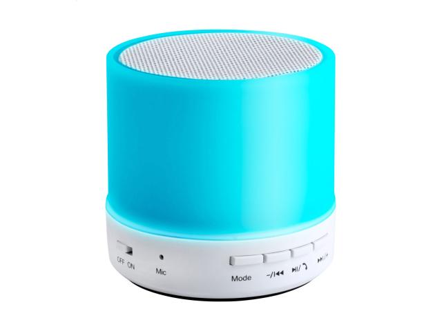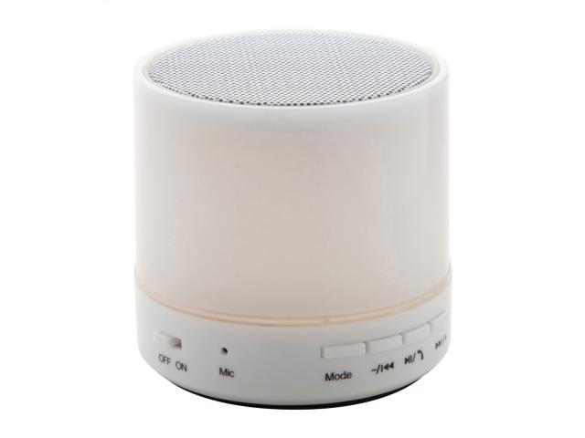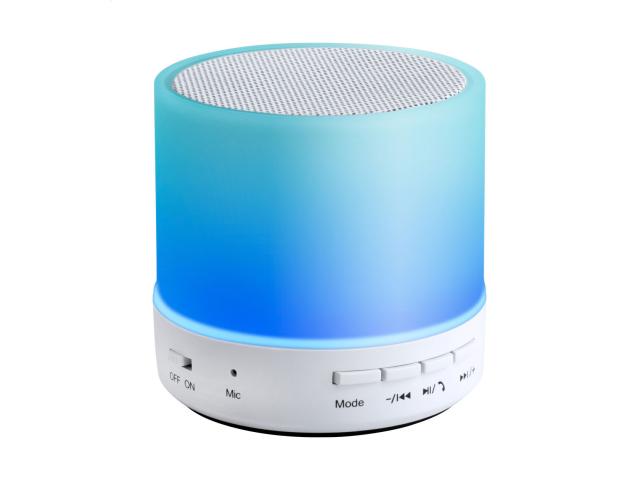 Wireless speaker in plastic housing with multicolour LED light. With hands-free call function, FM radio and built-in rechargeable battery. Including USB charger cable.