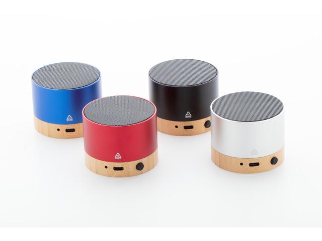 Recycled aluminium wireless speaker with bamboo base. With hands-free call function and built-in rechargeable battery. Including USB charger cable.