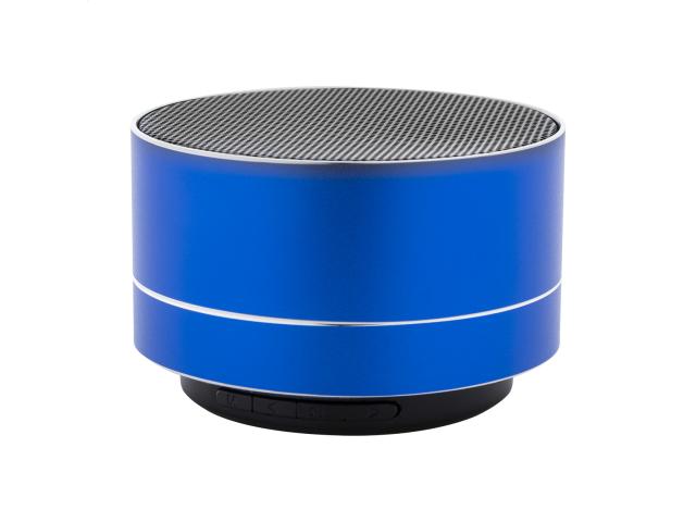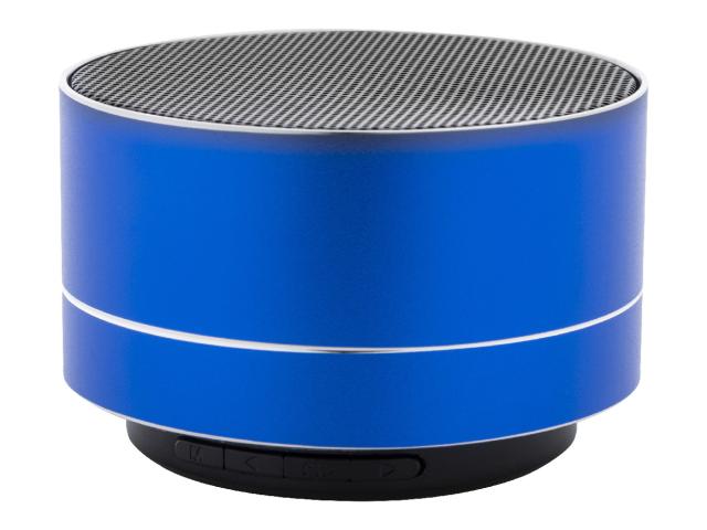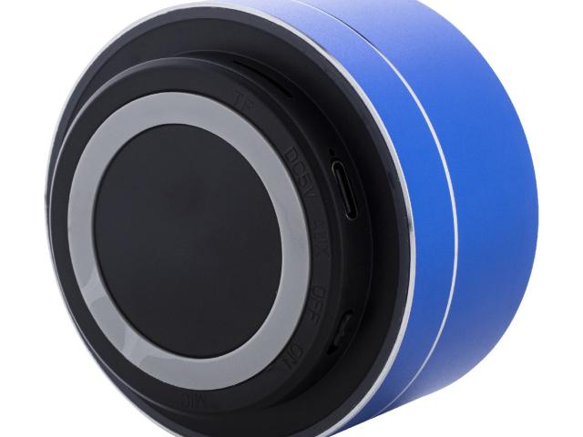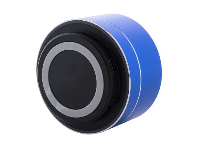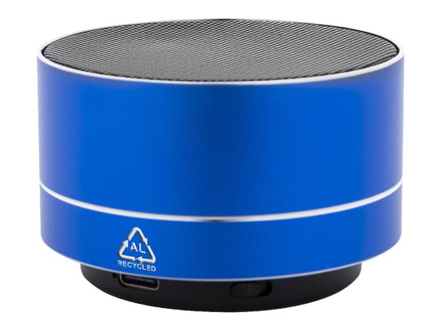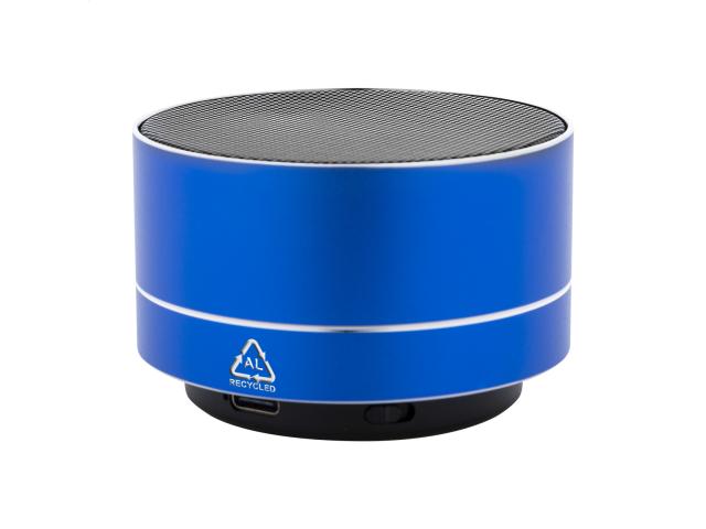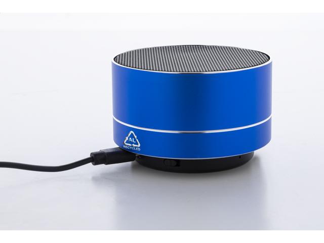 Recycled aluminium wireless speaker with metal mesh, LED light on the bottom and rechargeable battery (300 mAh). With hands-free call and micro SD MP3 playback functions. Including USB charger cable.