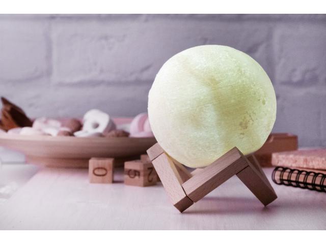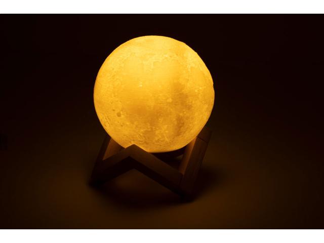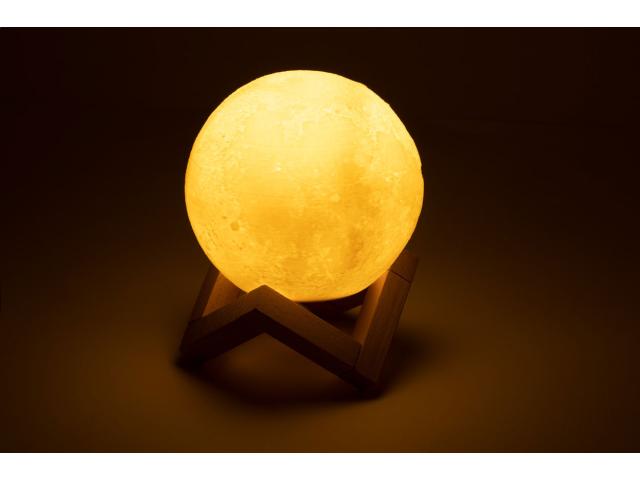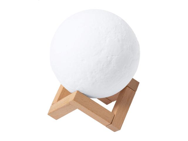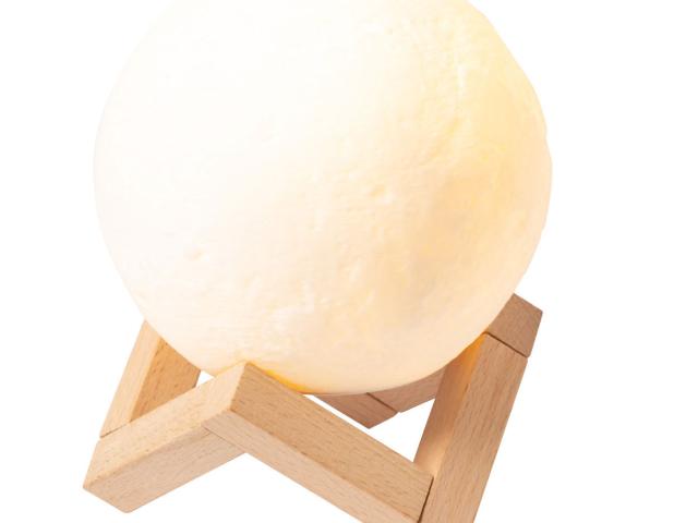 Moon shaped wireless speaker with built-in rechargeable battery and wooden stand. LED lights with warm and cold light and adjustable brightness. Including USB charger cable.