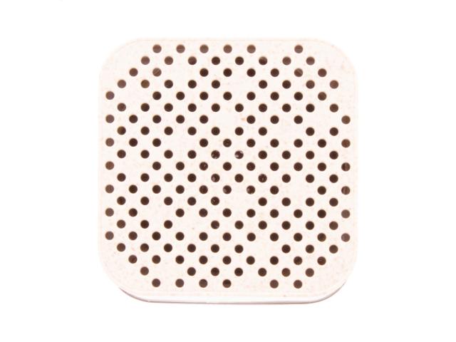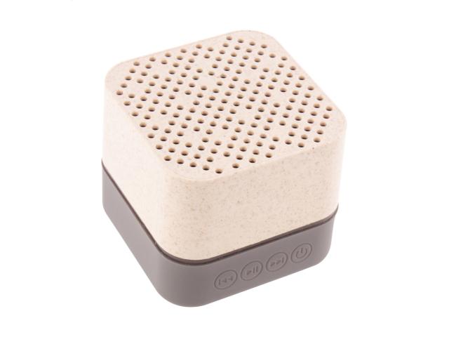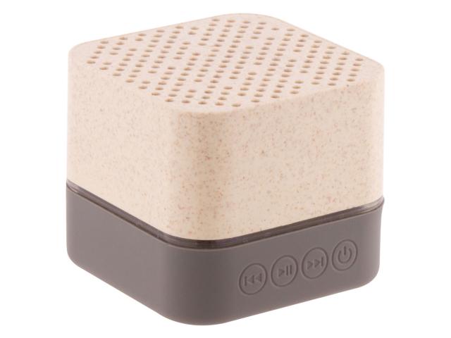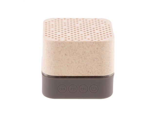 Wireless speaker in ecological wheat straw plastic housing with rubber bottom part, multicolour LED light and built-in rechargeable battery. With hands-free call and micro SD player functions. Including USB charger cable.