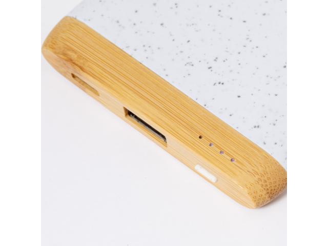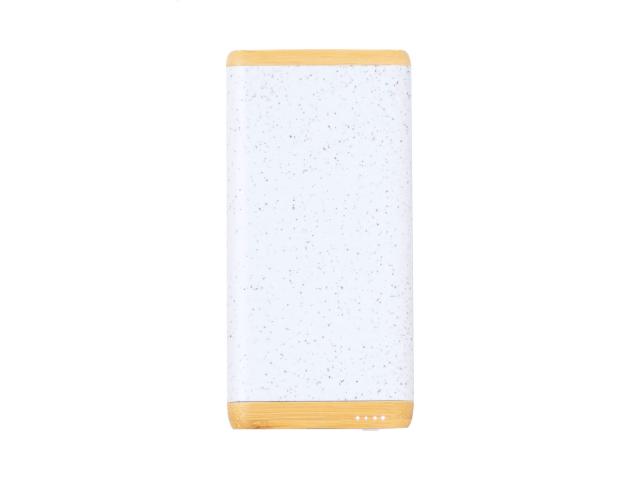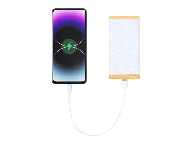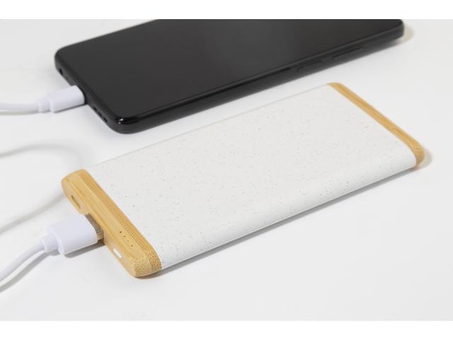 USB power bank in bamboo and ecological wheat straw plastic housing with 5000 mAh battery. With 1 USB and 1 USB-C charger ports. USB-C input port. Including USB charger cable.
